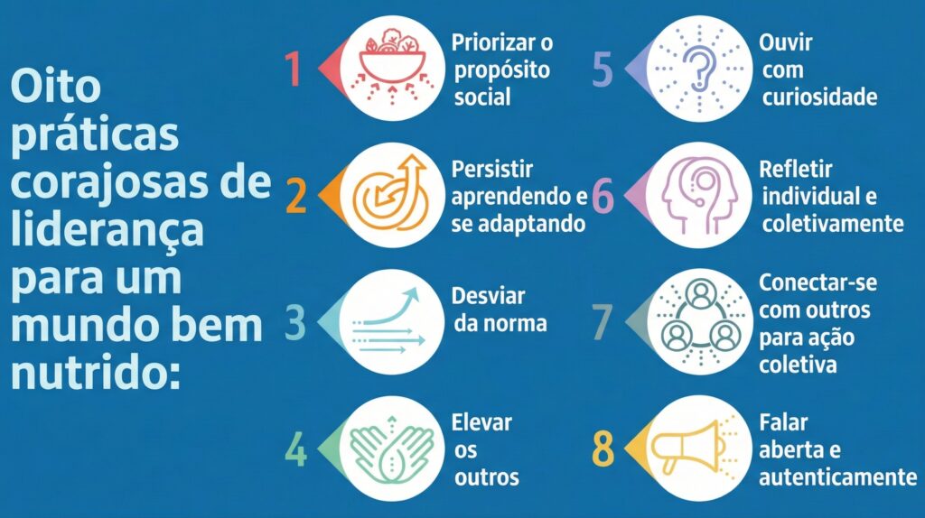 Para alcançar essa transformação, o NGLC compromete-se a adotar e fortalecer proativamente suas oito práticas corajosas de liderança (veja-as abaixo e em detalhes no nosso Manifesto), individualmente, em nossos locais de trabalho e nas redes mais amplas de sistemas alimentares e nutrição.